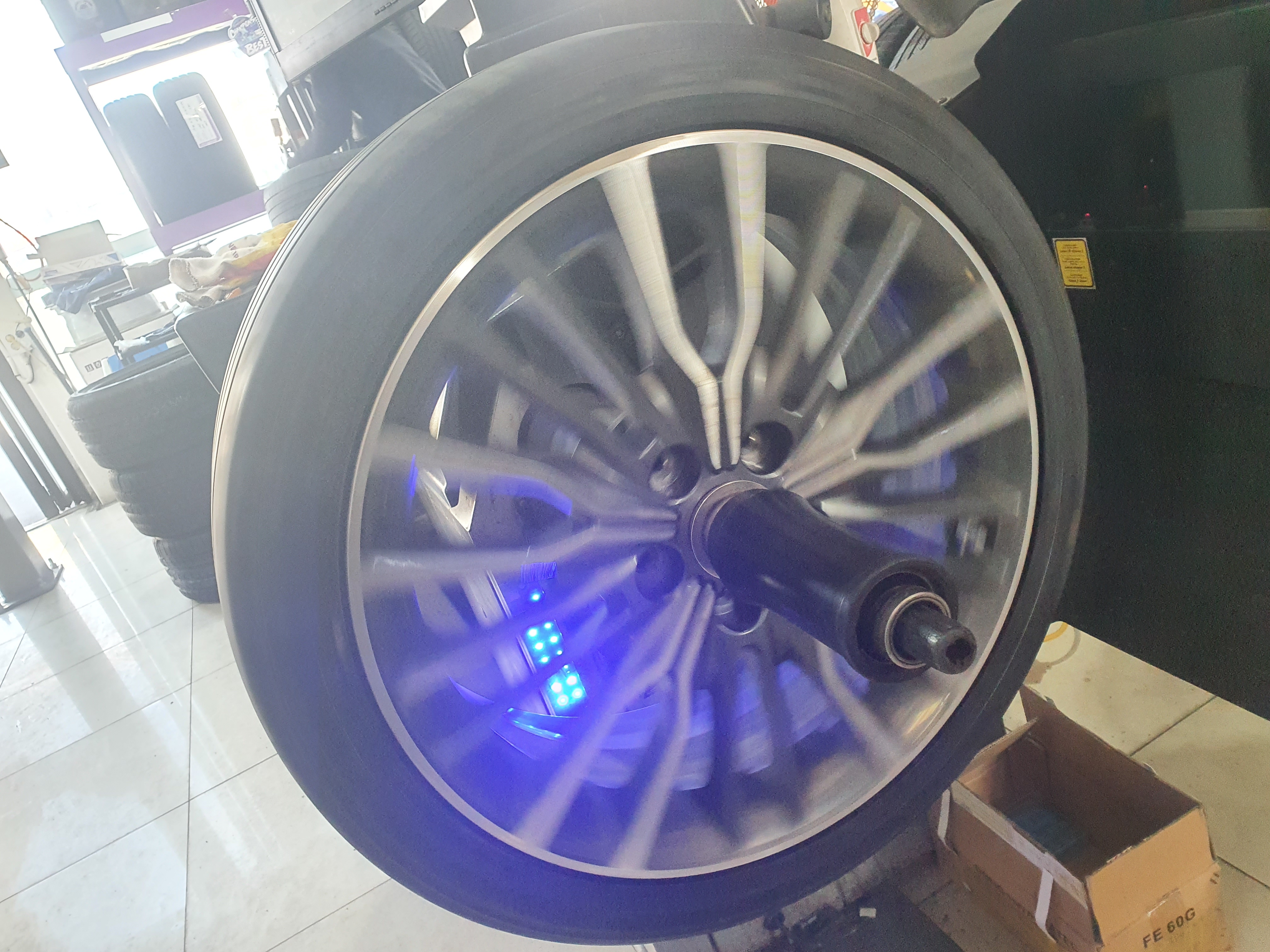타이어 장착후 휠밸런스 측정을 위해 타이어 셋팅후 회전 시킵니다.
