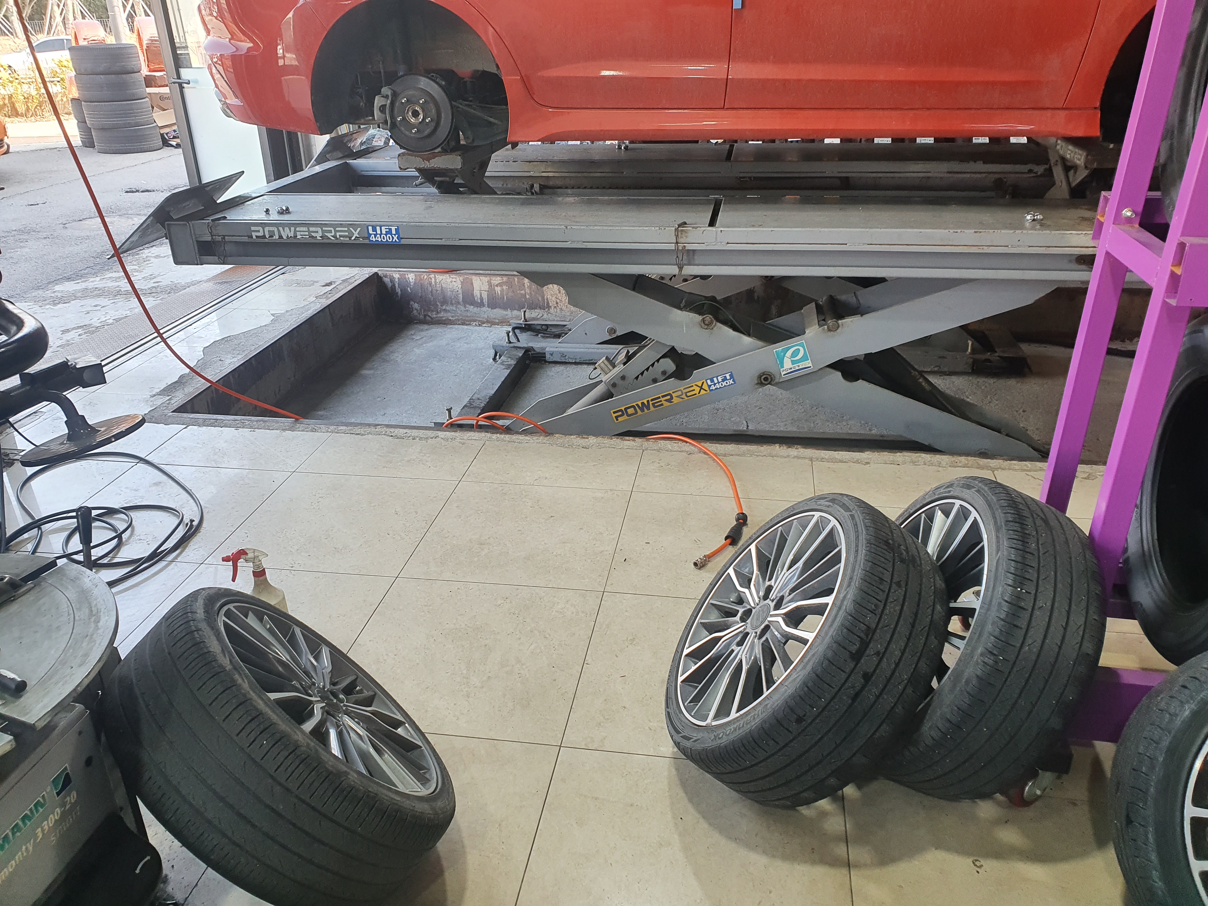 타이어교체를 위해 차량 바퀴 모두 탈거합니다.