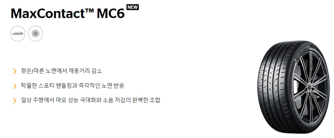 콘티넨탈 MC6 의 장점은 비대칭 리브 구조로인한 롤링 방지 / 노이즈브레이커 삽입으로 인한 저소음 / 젖은 노면에서의 짧은제동거리 및 접지력