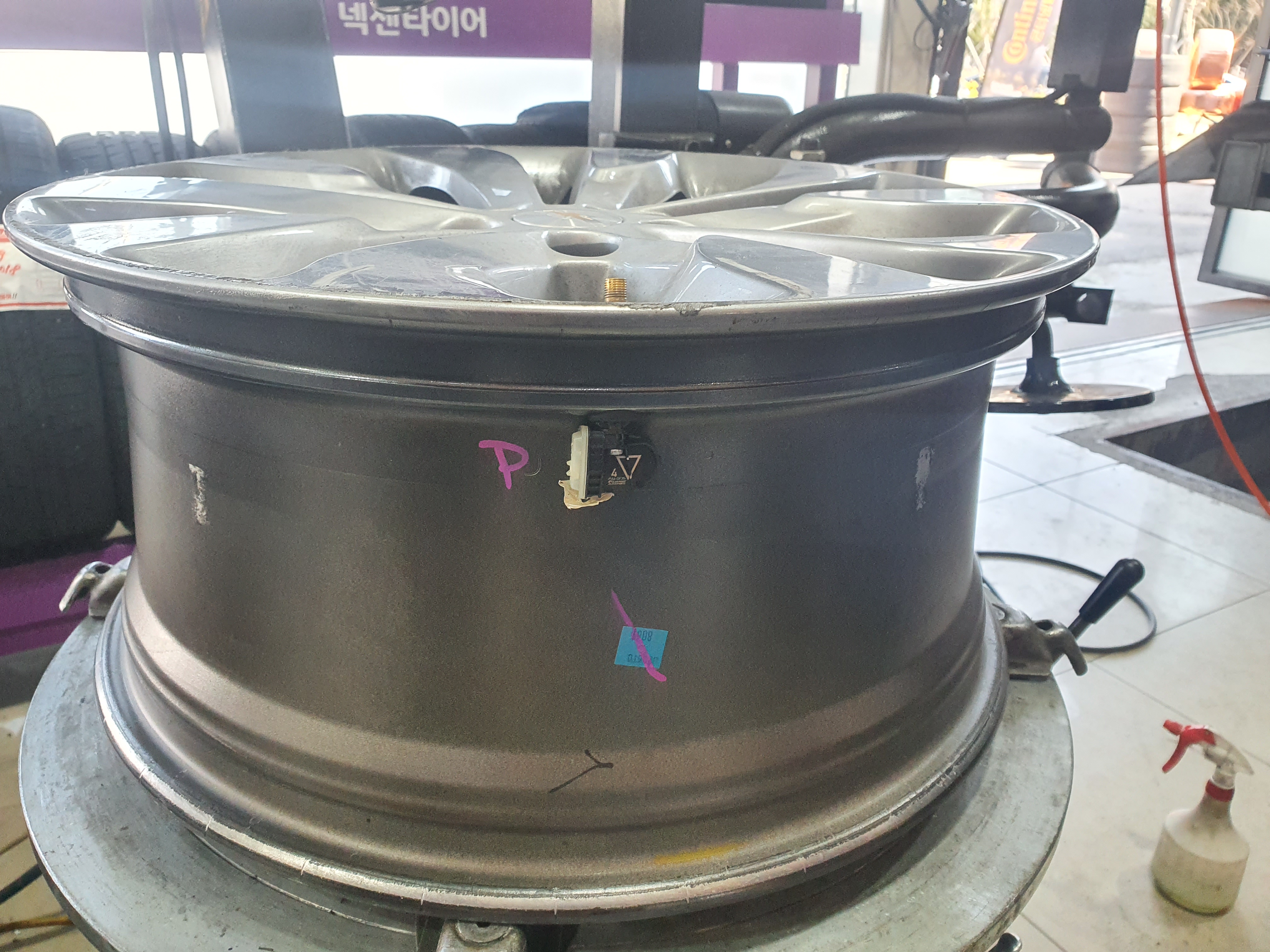 휠중간에 보이는 검은색 물체가 TPMS 쎈서입니다. 타이어 교체시 파손이 될수 있으니 유의 해야 합니다.